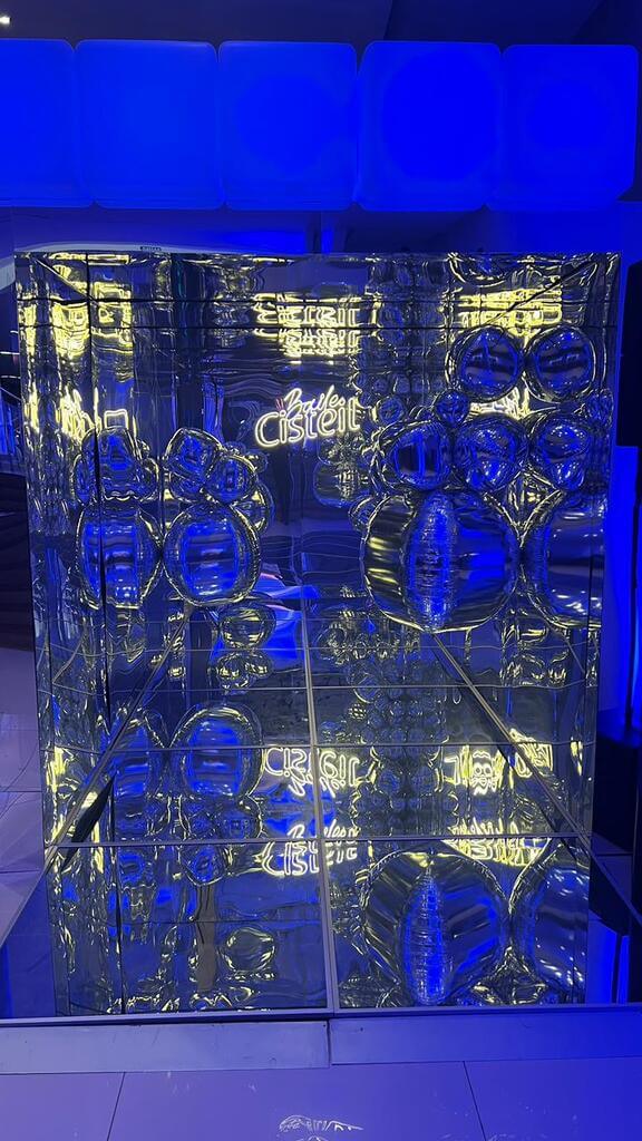 Estrutura cenográfica modular desenvolvida para experiências visuais imersivas com foco em efeito infinito, reflexos e impacto fotográfico.
